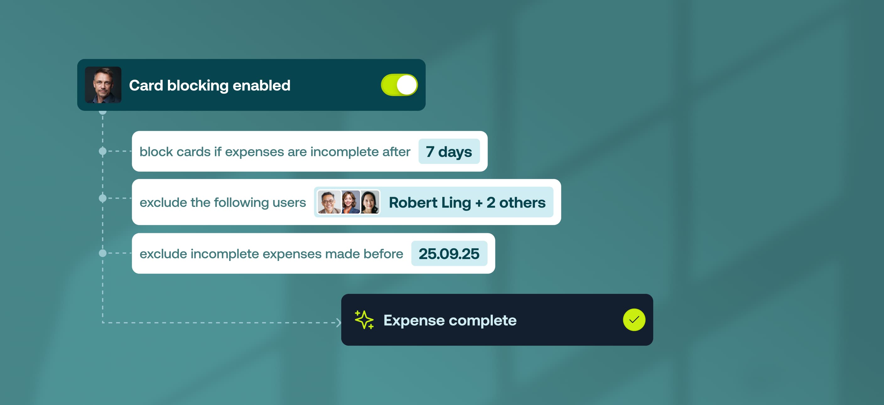 Finance teams can now set a start date at which card blocking will start counting incomplete expenses from. This means that you can now enable card blocking for your organisation even if you have staff with lots of old incomplete expenses.