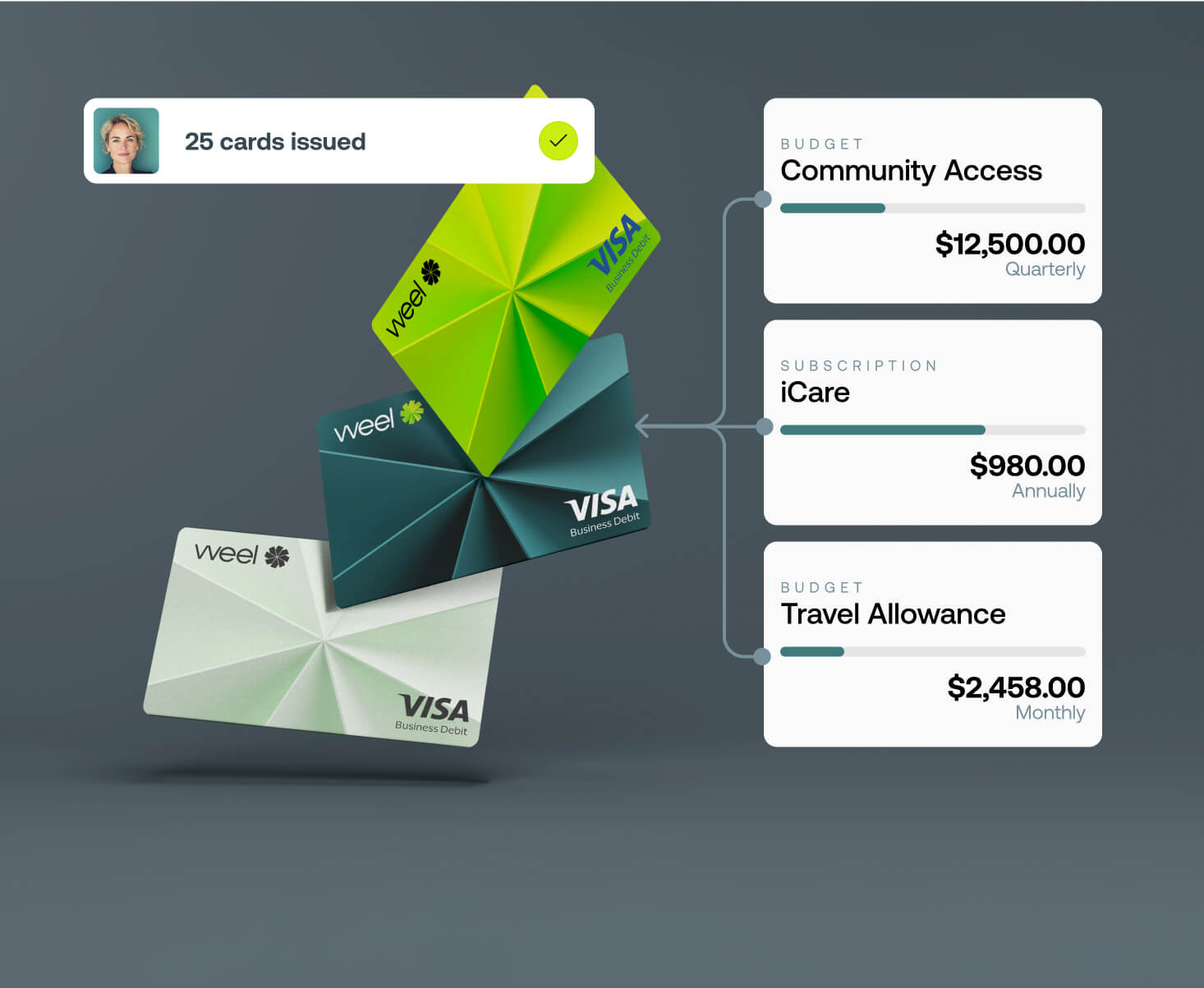 Weel streamlines participant and operational expense management end-to-end, from virtual cards and pre-approvals to receipt capture, reconciliation, and reporting. You gain real-time visibility by participant, program, or cost centre while reducing manual admin and tightening compliance.