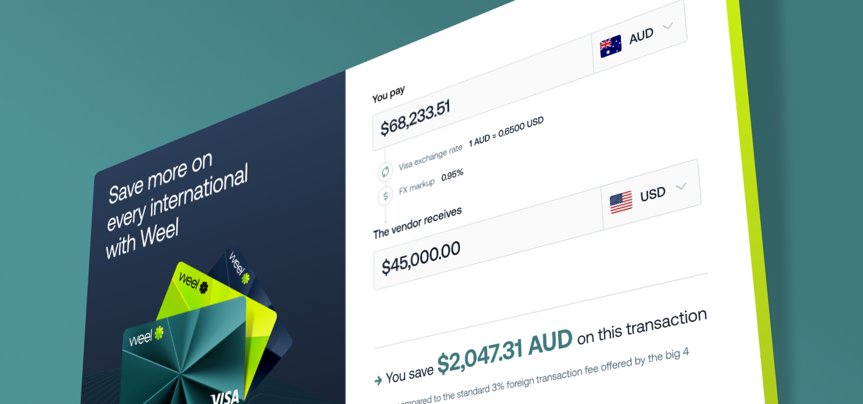 Learn moreWe want to help you understand and save on international transactions: Introducing Weel’s FX Savings Calculator. This tool allows you to see how much you can save on foreign exchange (FX) fees by using Weel for your international payments.
