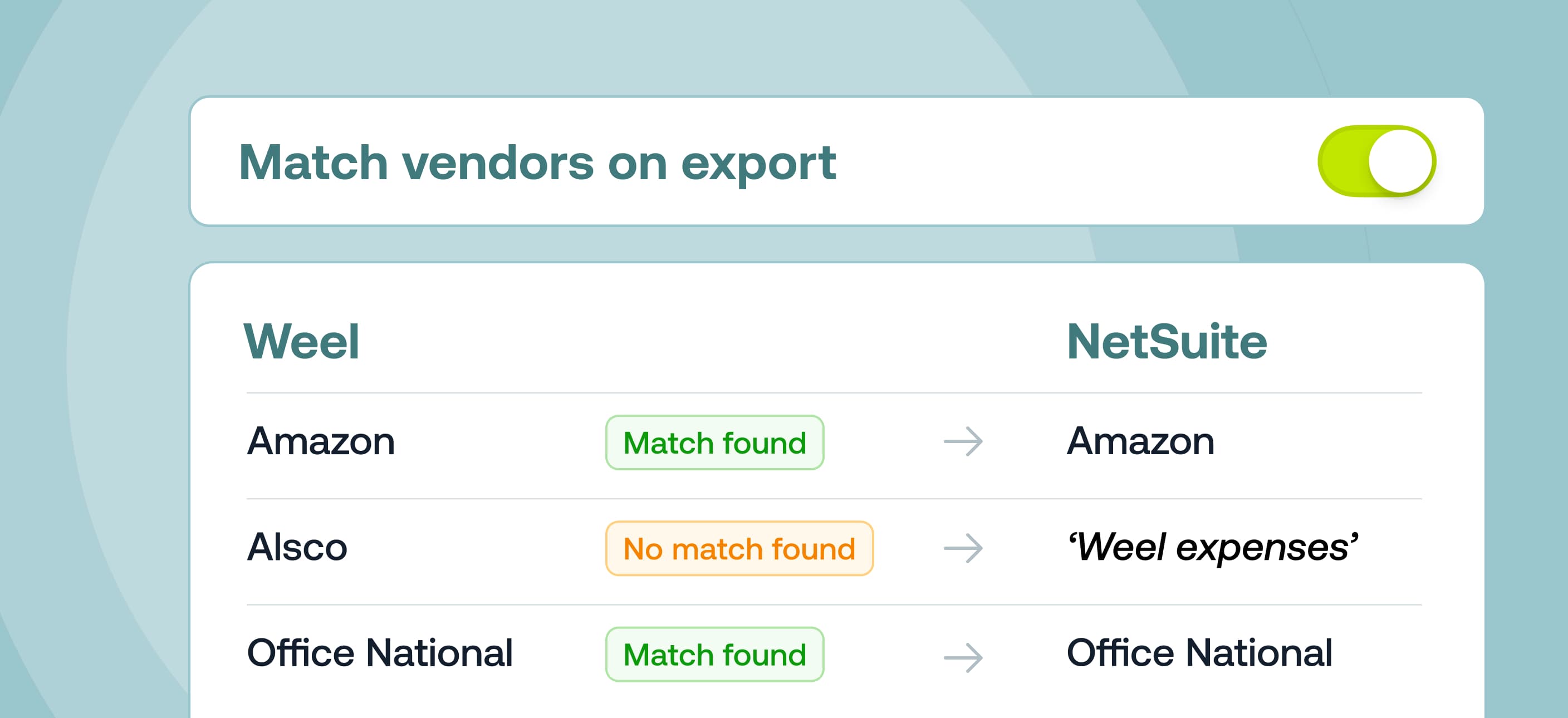 You can now configure your NetSuite integration to export transactions to a ‘Weel Expenses’ vendor if no existing vendor is found in NetSuite. This is to make things tidier for finance teams who don’t want a proliferation of small, one-off vendors when reconciling their Weel expenses in NetSuite.