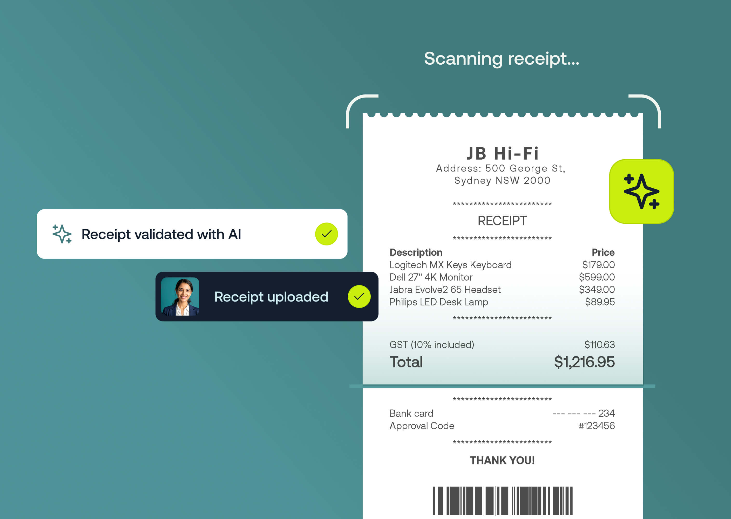 Weel's AI receipt validation automatically verifies merchant, amount, currency, GST, and invoice legibility, flags any issues for review, and auto-fills GST on validated invoices.
